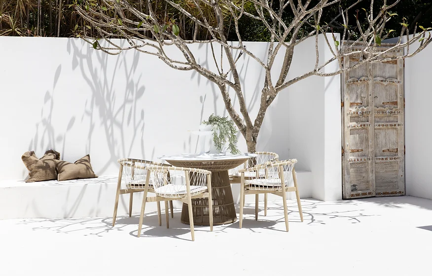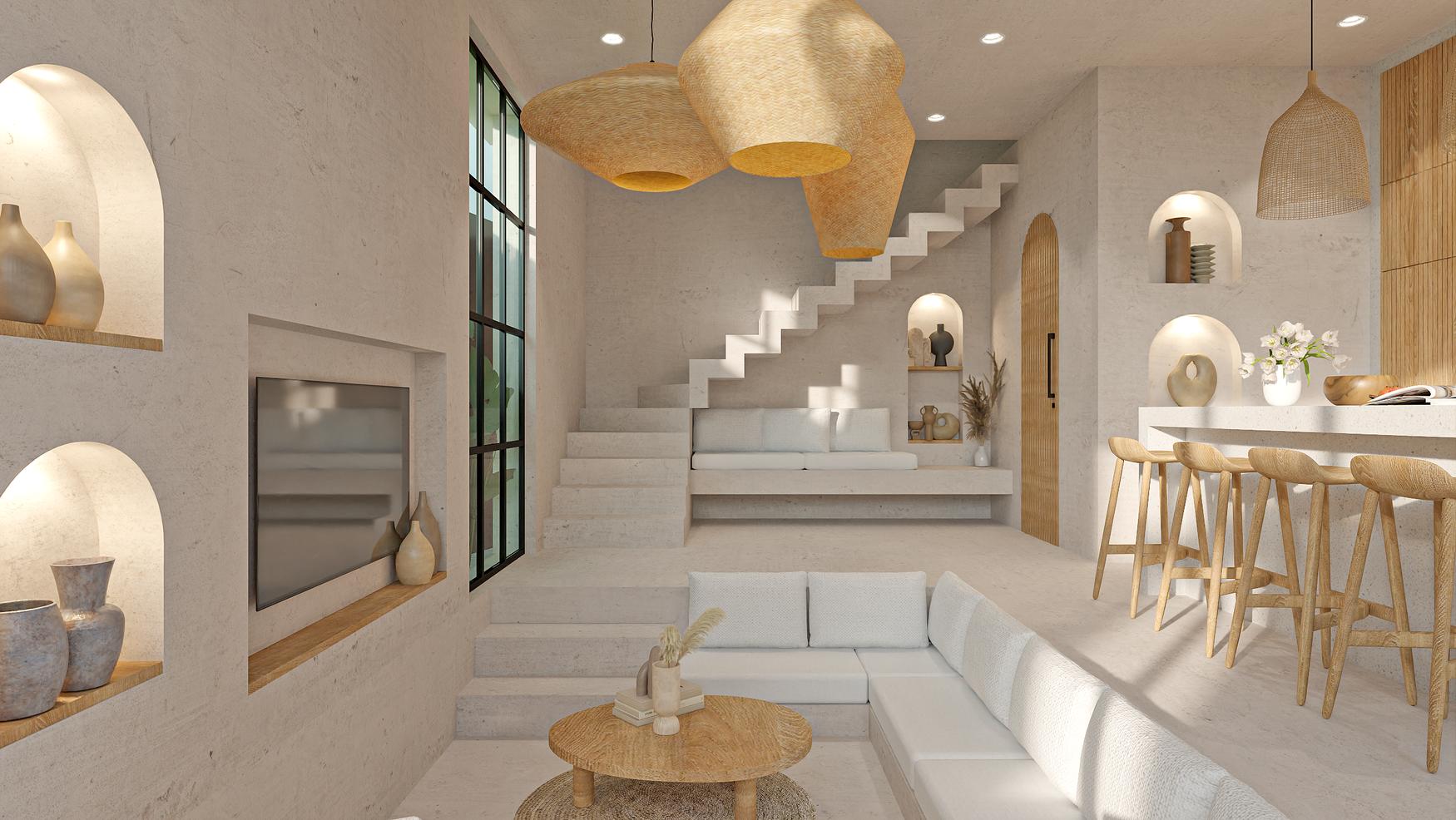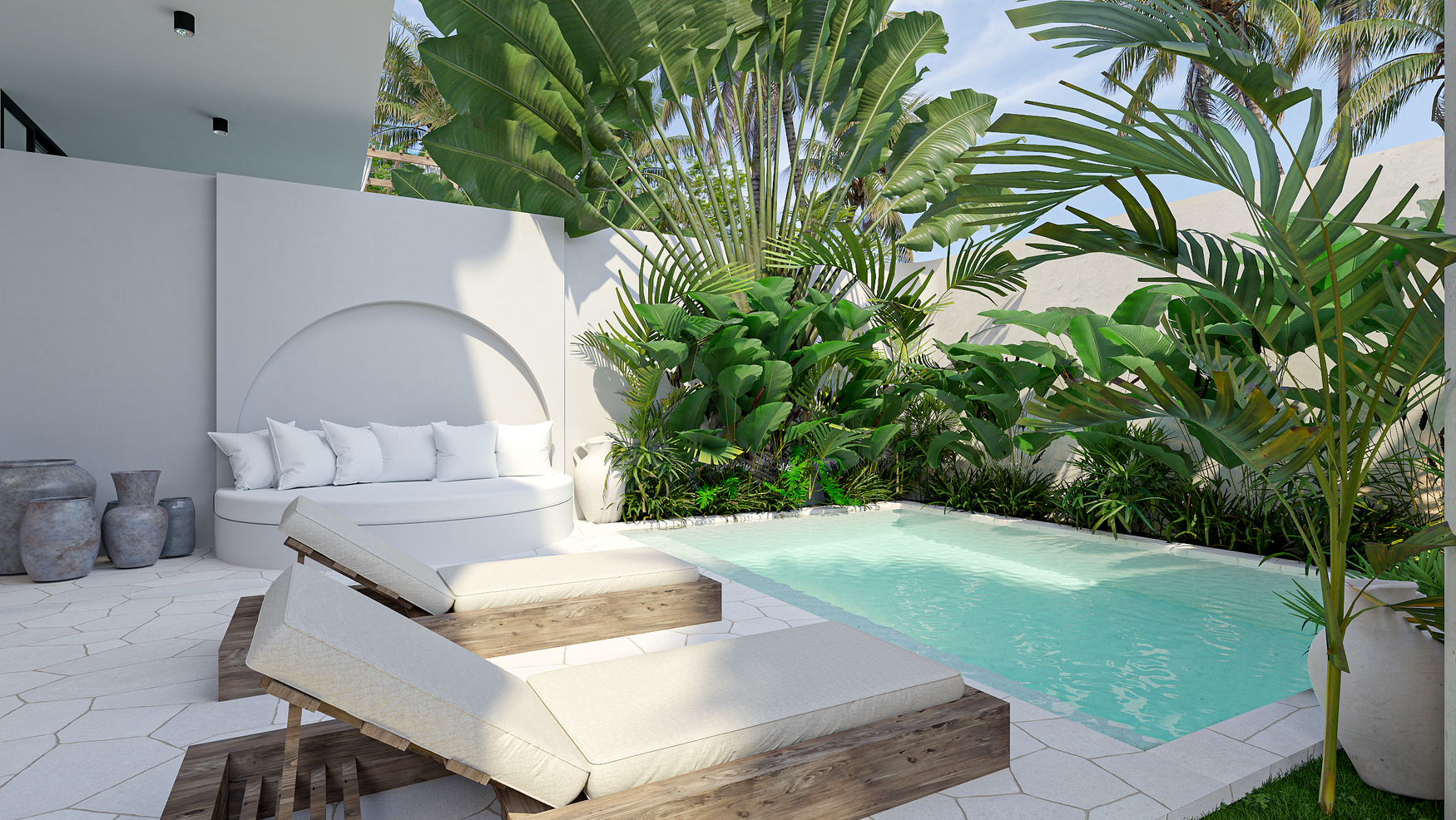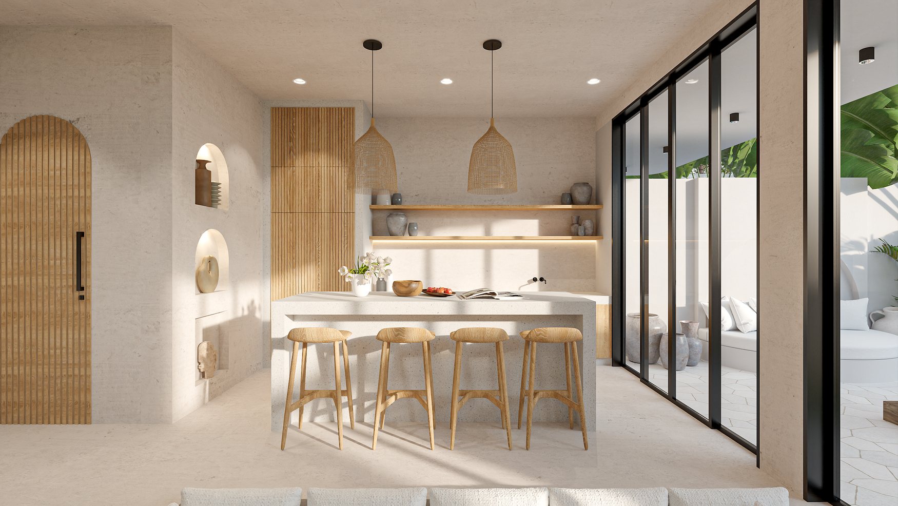 Our designs have a unique signature that embraces modern Mediterranean elegance and the natural beauty of the surroundings to create a harmonious blend of living spaces. Using clean curved lines and feature arches. Combining 50 shades of textured white and natural materials such as wood, stone and clay. Creating open-air spaces that blur the boundaries between inside and outside. Our signature floor to ceiling sliding glass panels allow for uninterrupted views and a seamless transition between the indoor and outdoor areas, flooding the villas with natural light. Lush tropical gardens and perfectly placed feature plants, water features, and stone pathways create a peaceful and serene environment. Every detail counts!